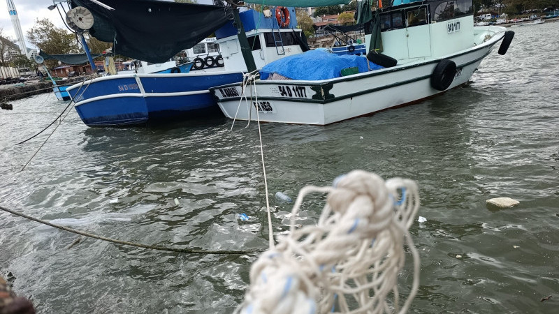 Olumsuz hava koşulları nedeniyle denize açılamayan balıkçılar, limana bağladıkları teknelerinin halatlarını sağlamlaştırarak önlem aldı. (AA)