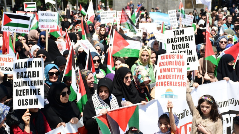 Cedidiye Meydanı'nda toplanan kalabalık, ellerindeki Türk ve Filistin bayraklarıyla Anıtpark Meydanı'na yürüdü. Grup, "Çocuklar ölürken sessiz kalınmaz, "Gazze'de soykırım var" ve Özgürlük için yürüyoruz" yazılı pankartlarla İsrail ve ona destek veren ülkeler aleyhine slogan attı.