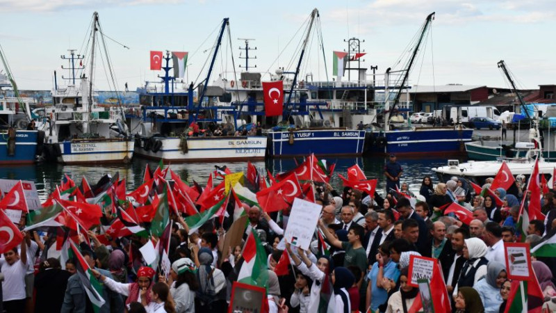 Konuşmaların ardından bölgedeki hava muhalefeti nedeniyle denize açılamayan balıkçılar, teknelerinin sirenlerini çalarak ellerinde Türkiye ve Filistin bayraklarıyla alanı dolduran kalabalığı selamladı.